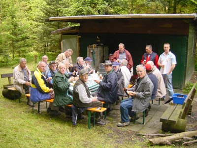 Dieses Jahr hatte der Festausschuß Freunde und Sänger des Chores, vom Sängerheim Honrath ausgehend, wieder auf Tour geschickt. Die Route ging zunächst zur Ortschaft Scheid über Gammersbach nach Kleinhecken. Dann ging es weiter entlang der neu angelegten Wanderwege durch das abfallende Waldgelände nach Menzlingen, zu der idyllisch gelegenen Teichanlage im Menzlinger Tal. Die an Romantik kaum zu überbietende, gepflegte Anlage bietet ein altes restauriertes noch laufendes Wasserrad., dessen Geplätscher für die nötige innere Ruhe und Erholung des Tagesablaufs sorgt. Auch nicht befugte Wanderer überlegen sofort, was man wohl aus diesem Wasserrad noch machen kann? Ob man da wohl noch Strom für eine Lichtanlage erzeugen kann? Mit Schmackhaften Fischgerichten hatten unsere Sänger Günther Cremer und Sohn Stefan zusammen mit den Teichvertreibern ein schönes Menue vorbereitet, was auch , mit rheinischen Gesangseinlagen untermalt, in die gemütliche Atmosphäre des Nachmittags passte. |