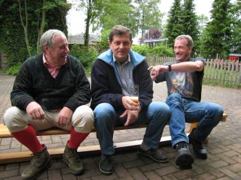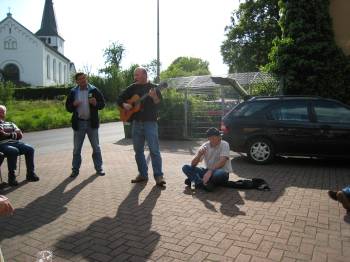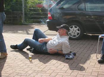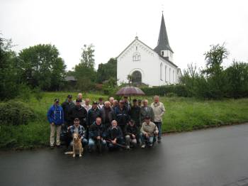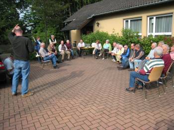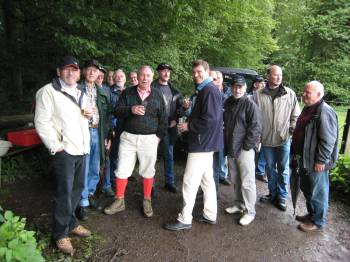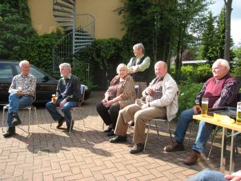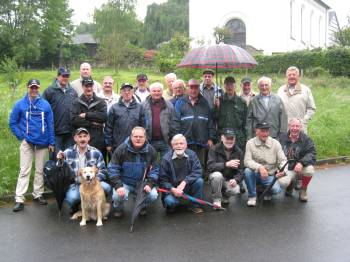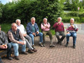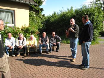 16 Sänger und 3 Gäste trafen sich um 10.00 Uhr in der Vereinsschenke. Pauli übernahm alle Kosten für Speis und Trank. Als Geburtstagsgeschenk bekam er einen Gutschein für einen Segelflug. Nach kurzem Frühschoppen ging die Wanderung bei leichtem Regen los. Es ging den Kammerberg herab. Bei Naafs Häuschen überquerten wir die Agger. Es ging weiter am Steilhang der Agger bis Cyriax, dann steil bergauf bis Halfensbüchel. Hier sollte Rast gemacht werden; doch wo waren Gottfried und Martin, die uns mit Verpflegung versorgen sollten. Hoffentlich stehen sie nicht an einer falschen Stelle! Da kam Martin endlich mit seinem Schirocco angebraust. Es ging noch etwas weiter bis zu einer Bank am Waldrand. Eine Bank für 21 Personen, aber es war sowieso zu nass, um sich zu setzen. Bei einem Fässchen Bier und dicken Mettwürsten sang man gut gelaunt ein paar Trinklieder. Dann wurde die Wanderung weitergeführt durch den Wald nach Kombach über Agger und Weißenberg zurück zum Sängerheim. Uwe Roth zündete den Grill an und es gab leckere Grillspezialitäten. Jetzt ließ sich auch die Sonne sehen. Im Freien gab es eine lustige Feier. Uwe Demski holte seine Gitarre. Dann wurden Lieder gesungen von den Bläck Föös, Jonny Cash, Reinhard May und viele andere. Einige Solisten sangen sogar das gestörte Ständchen. Bis 22.00 Uhr ging das stimmungsvolle Treiben. Der MGV bedankt sich bei Pauli für die Geburtstagsparty.