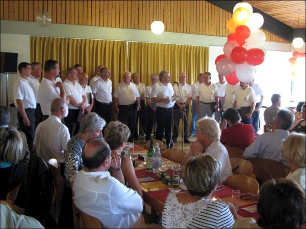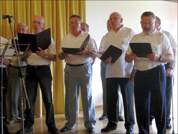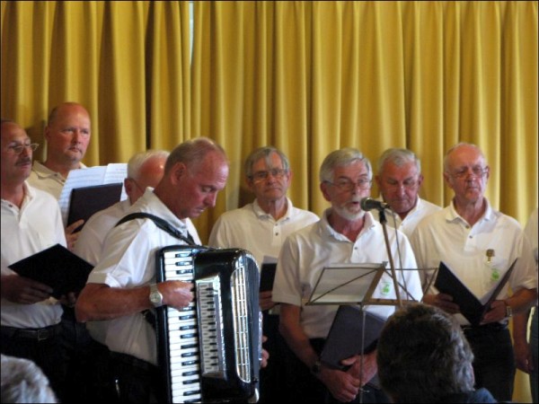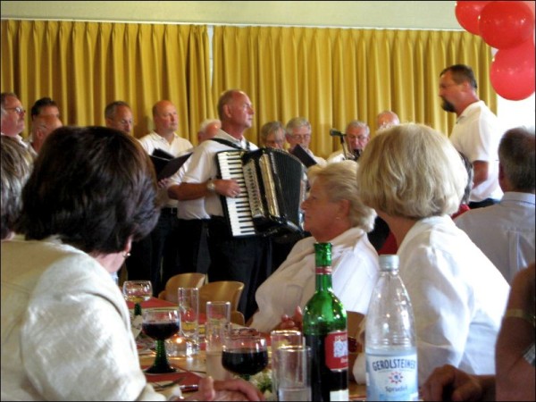 Kölsche bergische Sproch und Tafelgerichte und mentale Eindrücke und Gewohnheiten der hier wohnenden Bevölkerung wurden von den Interpreten in musikalischen Sätzen wiedergegeben. Musikdirektor Rolf Pohle, noch beflügelt von dem großartigen Abschneiden beim Bundesleistungssingen in Werl mit der Singgemeinschaft Birk, hatte so schon wenige Tage danach das nächste musikalische Highlight mit dem MGV Honrath beim Rheinischen Abend zu leiten. In der bergischen Komposition von Frank Sinatra "May way" gelang dem Chor mit dem schönen Solo von Walter Oberdörster ein melancholisch anmutiger Vortrag. Die alten Tage mit einem dörflichen Gemeinschaftsgefühl wünscht man sich zurück, wenn man an den rührenden Text "In unserem Veedel" denkt . Die Fassung von Rolf Pohle "Bergisches Heimatlied - Honrather Textung ob Kölsch " verstärkte dieses nachdenkliche Selbstwertgefühl noch. Um so überzeugend in bergischem Kölsch solistisch auftreten zu können, muss man von der Sprache und den Lebensgewohnheiten her ein bergisches Urgestein sein . Im Vortrag des MGV Honrath im kleinen "Ostermann Potpourri" gelang wiederum Walter Oberdörster in musikalischer Begleitung mit Wolfgang Hilleke am Akkordeon eine überzeugende schön klingende solistische Einzelleistung. Ein Highlight mit "Dat Wasser vun Kölle" interpretiert vom MGV Honrath mit dem souverän vortragenden Solisten Thomas Knoop bekam besonderen begeisterten Beifall. Kalli Müllenbach aus Hoffnungstal-Höfferhof, bekannt durch gemeinsame Auftritte mit dem Karnevalisten und Diakon Pauls aus Wipperfeld , konnte mit seinem ideenreiche Auftritt die Zuhörer zum Lachen bringen. Zwischenzeitlich hatten sich die Gäste am bergischen Tafel-Buffet gestärkt und waren wieder aufnahmebereit für das stimmungsvolle gelungene Einzelsolo mit Gitarre von MGV Sänger Uwe Demski in "Wenn die Kölsche singen ..." und dem temperamentvollen "Spanienlied". Wolgang Hilleke hatte ein weiteres stimmungsvolles Animationsprogramm mit bekannten rheinischen Liedern im Repertoire. Gespielt mit Akkordeon wurde ließen sich die mitsingenden Gäste zu einem bewegenden unaufhaltsamen Stimmungskarussell hinreißen. Die Sänger des MGV Honrath bedanken sich noch mal bei allen Gästen für die Unterstützung unserer Veranstaltung . |