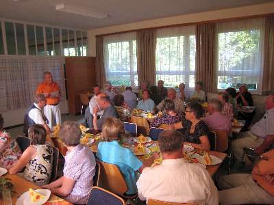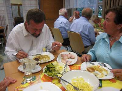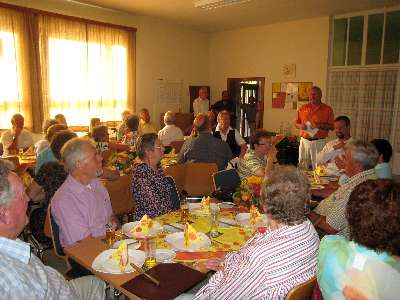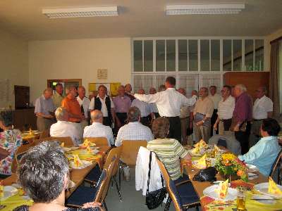 Traditionsgemäss werden Ehrungen von Sangesbrüdern im Rahmen eines gemütlichen Abends, zusammen mit den Partnerinnen der Sänger vorgenommen. Dieses Jahr konnten wir den Sängern Günther Pach zur 60-jährigen Vereinszugehörigkeit, Herbert Gelfert zur 50-jährigen Vereinszugehörigkeit mit Ernennung zum Ehrenmitglied, Reiner Erlinghäuser zu 50 Jahre Singen im Chor (49 Jahre beim MGV Bleifeld) und Lothar Peters zu 10 Jahren 1. Vorsitzender des MGV gratulieren. Nach der Begrüßung der Anwesenden durch den 1. Vorsitzenden wurden die Ehrungen vorgenommen. Für Lothar trug Hans Naeschen eine ausführliche Laudatio über seine vielfältigen Verdienste vor. Anschließend sang der Chor unter Leitung seines Chorleiters Rolf Pohle drei Lieder und das Hoch zu Ehren der Jubilare. Das köstliche Essen (Rouladen, Krustenbraten, verschiedene Gemüse, Spätzle, Kartoffelgratin und Nachtisch) wurde von einigen Sängerfrauen serviert. Für Geträke sorgten unsere Wirte Walter und Siegfried. Anschließend wurde noch lange bei gemütichem Plausch und guter Laune, aufgelockert durch einzelne Gesangsvorträge, gefeiert. |
