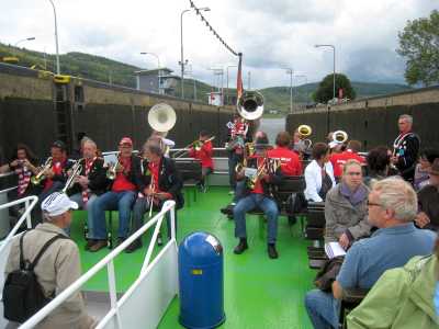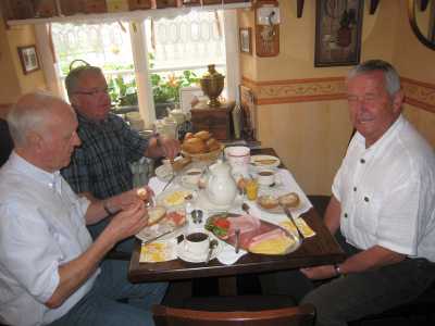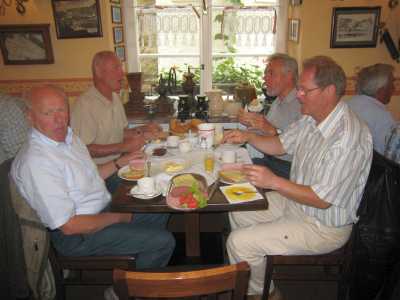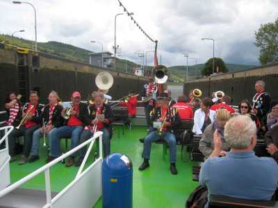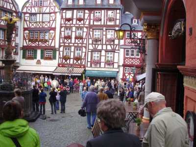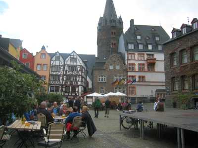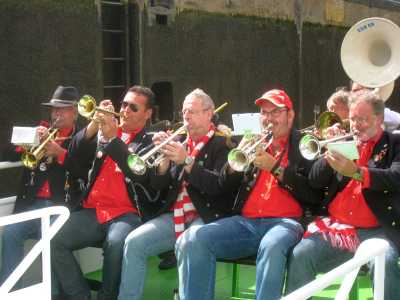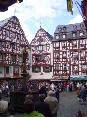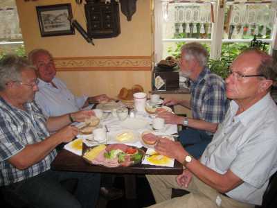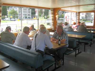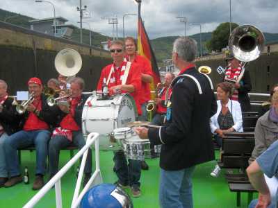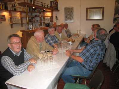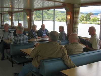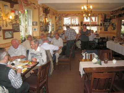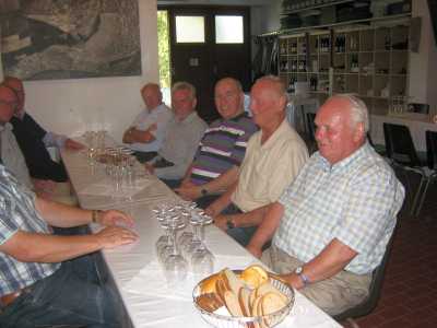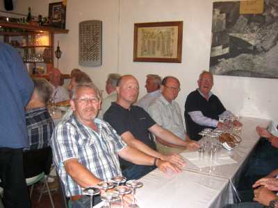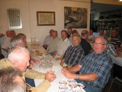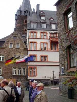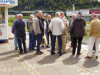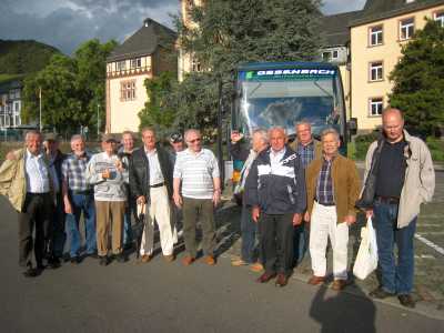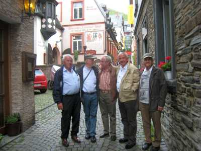 An einem leicht verregneten Samstagmorgen starteten um 8,34 Uhr 20 Sänger am Sängerheim mit dem Bus in Richtung Beilstein an der Mosel. In Donrath stieg noch Sangesbruder Dieter Lauches hinzu. Bernd Esser hatte als Organisator dieser Fahrt für 10.30 Uhr ein Frühstück in Beilstein organisiert, welches wir im Cafe Klapperburg einnahmen. Das Ambiente des Cafes ist gekennzeichnet durch eine riesige Sammlung alter Kaffeemühlen in den Gästeräumen. Der ständige Wechsel des Wetters ließ uns nur eine kurze Besichtigung zu. Es ging zur Weiterfahrt nach Traben welches wir in 45 min, dann erreichten. An der dortigen Schiffanlegestelle begaben sich die Sänger auf das Schiff in Richtung Bernkastel, denn dort sollten wir j a noch die meiste Zeit des Tages verbringen. Während der Fahrt auf dem Schiff wurden uns Besonderheiten des Moselgebietes per Lautsprecher erklärt. Außerdem sorgte eine unterwegs zugestiegene Musikgruppe aus Holland mit schweren Blasinstrumenten an Bord für Stimmung. In Berkastel angekommen formierten sich die Sänger am Hafen um ein kurzes Ständchen zu präsentieren. Von nun an ging es locker in Gruppen und nach Interessen zur Stadtbesichtigung. Das Angebot vollzog sich von Burgbesichtigung bis Cafebesuch oder des Flanierens zwischen alten Fachwerkhäusern und historischen Gassen mit interessanten Geschäften. Als der frühe Abend sich näherte und unser Busfahrer Peter das Signal zur Weiterfahrt am vereinbarten Parkplatz gab, ging es zum Weingut Port in Bernkastel--Kues. Der freundliche Winzer erklärte uns den Ablauf seines in der Familie geführten Betriebs und bewirtete unsere Gruppe mit 8 Weinen. Jeder Wein wurde im Gespräch mit ihm geschmacklich analysiert. Den Abschluss bildete ein moselländischer Abend mit Schwenkbraten vom Grill. Die Sänger des MGV stimmten noch einige Lieder an und brachten den rheinischen Frohsinn den Wirtsleuten und auch einer Gruppe einheimischer Gäste ein Stück näher. Die tolle Stimmung verzögerte den Abfahrtsplan unseres Heimweges. Aber wer den MGV kennt, der weiß auch unseren Leitsatz "Vor Mitternacht kehren wir nicht Heim" |