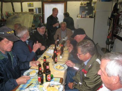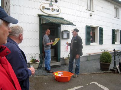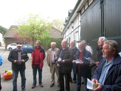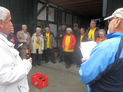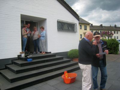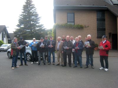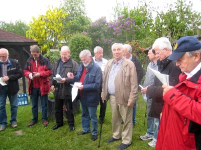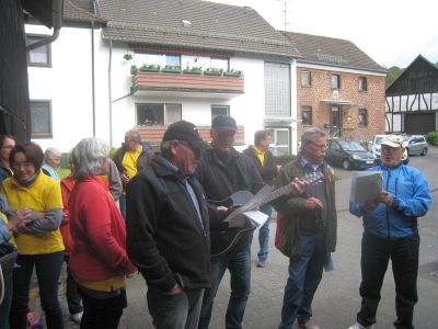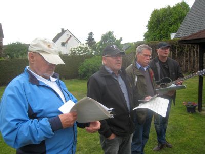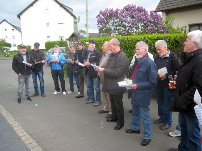 Am Pfingst-Samstag ist es eine Tradition des MGV Overath, alte Sponsoren zu besuchen und ihnen ein paar Liedchen zu singen.So machten sich auch dieses Jahr einige Sänger, unterstützt vom MGV Honrath, auf den Weg, diese Tradition aufrecht zu erhalten. Zuerst wurde sich im Garten von Uli Gückel etwas eingesungen, Texte verteilt und abgestimmt, was zum Besten gegeben werden sollte. Uwe Demski hatte seine Gitarre mitgebracht um einige Lieder zu begleiten. Angefangen wird an jeder Station mit dem "Komm Heiliger Geist du göttlicher Gast, der du von schwerer Sünde Last so manches Herz befreiet hast..." Schon vor Ulis Haus warteten einige Nachbarn auf uns und unser Ständchen. Dr. Knitter mit Familie beehrte uns mit einem Fässchen Bier, die Nachbarn vom Ferrenberg spendeten viel Applaus, auch bei der Dorfgemeinschaft Cyriax waren wir herzlich willkommen und vom Steinhofplatz durch die Hauptstraße besuchten wir noch weitere Sponsoren. Das sind nur einige der Stationen, wo wir durch die vorgetragenen Lieder, wie "Weinland", "Heimat", "Mein Vater war ein Wandersmann", "Die schöne Overatherin" usw. ein bischen Freude verbreiten durften. Wir bedanken uns ganz herzlich für die vielen Geschenke an Bier, Wein und Schnaps, die großzügigen Geldspenden und die vielen Eier, die fleißige Frauen zum Abschluß zu Rühreiern verarbeiteten, die wir in der Garage von Bruno in gemütlicher Runde verspeisten. Nochmal vielen Dank an alle Sponsoren und alle die zu diesem netten Nachmittag beigetragen haben. |