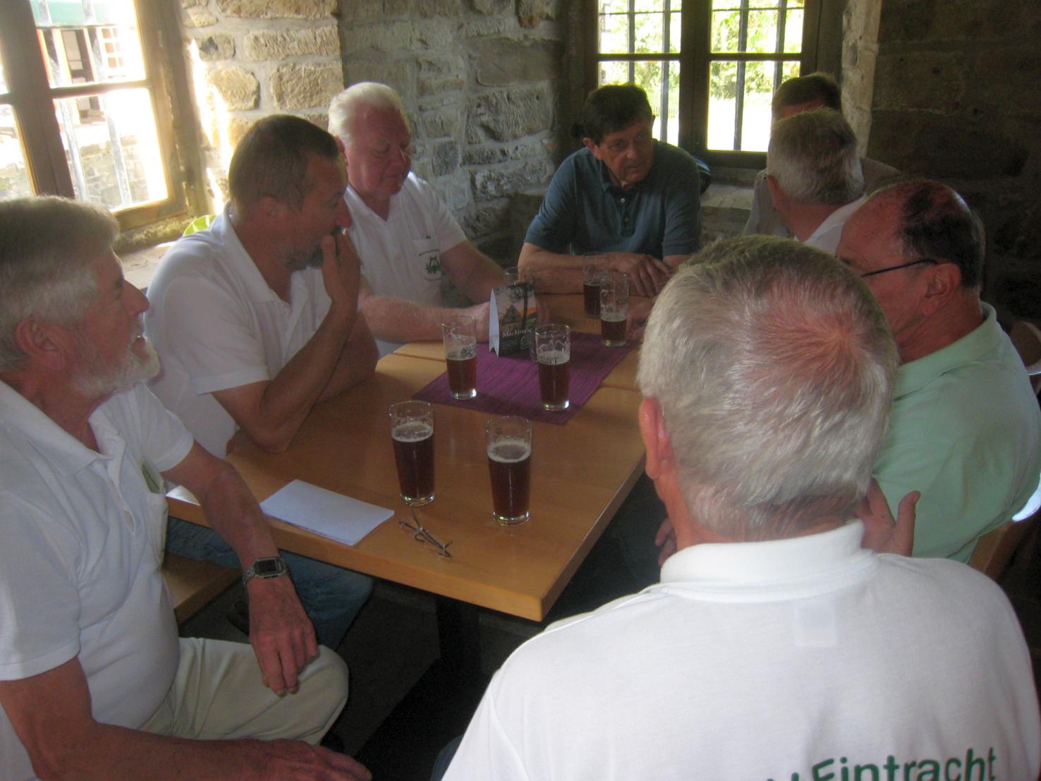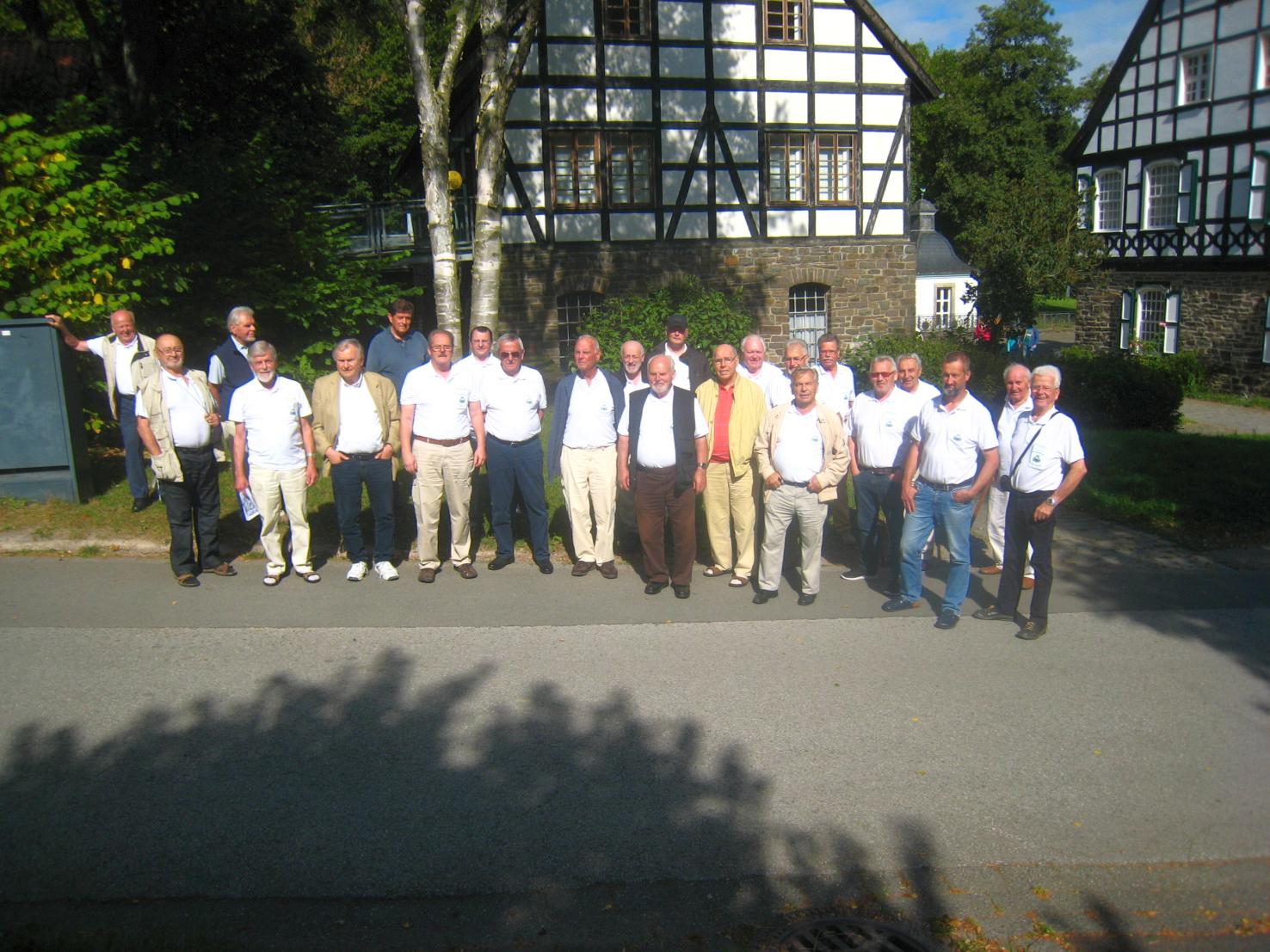 Landesmuseum Hagen ein attraktives Erlebnis für die Sänger. Bereits um 07.30 Uhr ging die Fahrt nach Sondern am Biggesee zum Restaurant "Seeterrasse". Ein vielseitiges Frühstücksangebot war zu diesem Zeitpunkt genau die richtige Entscheidung. Beeindruckt von der schönen Sauerlandromantik ging die Fahrt weiter über Meinerzhagen nach Hagen zum Freilichtmuseum. Viel Zeit stand für die eigentlich tagefüllenden 70 Besichtigungseinrichtungen zur Verfügung. Die beruflich aus verschiedenen Handwerks- und Dienstleistungssparten kommenden Sänger fanden schnell ihre Interessengebiete der Handwerkskunst vor und mit Beginn der Industriealisierung. Funktionen der Wasserkraft zur Stromherstellung oder die Bedeutung der Dampfmaschine waren hier in schön aufgebauten Werkstätten in ihren Funktionen u.a. in Sägewerks- Mühlen- und Metallverarbeitungstechnik zu sehen und wurden durch eine Führung in aktivem Funktionsablauf erklärt. Herstellen von Zigarren, Papier, Brot, Bohnenkaffee, Schmiedewerkzeuge, Seilerei, Edelsteinschmuck, Brot-und Bierherstellung und die Bedeutung der Holzwirtschaft gehörten unter anderem zum Informationstag. Es ergab sich ungeplant, dass ein Hochzeitsständchen am Museumsrestaurant für ein junges Brautpaar fällig wurde. Auch im Museumsbereich gab es kleine musikalische Kurzauftritte des Chors mit bekannten Volksliedern. Zum Abschluss mit Abendessen, hatten die Organisatoren Walter Oberdörster und Rüdiger Braesicke im Restaurant Wuttke in Wildbergerhütte das gemütliche, stimmungsvolle Beisammensein geplant. Beide Chorleiter, Rolf Pohle und Vice Wolfgang Hilleke gaben bei der Ankunft des Chors am Restaurant einige schmissige musikalische Leckerbissen zum besten. Uwe Demski sorgte mit Gitarrenbegleitung mit kölschen Liedern für das gewollte begeisternde Stimmungsbild des Abends. Insgesamt ein schöner Ausflug dessen Eindrücke nachhaltig sein werden. Vielen Dank an die Organisatoren des Ausflugs. |