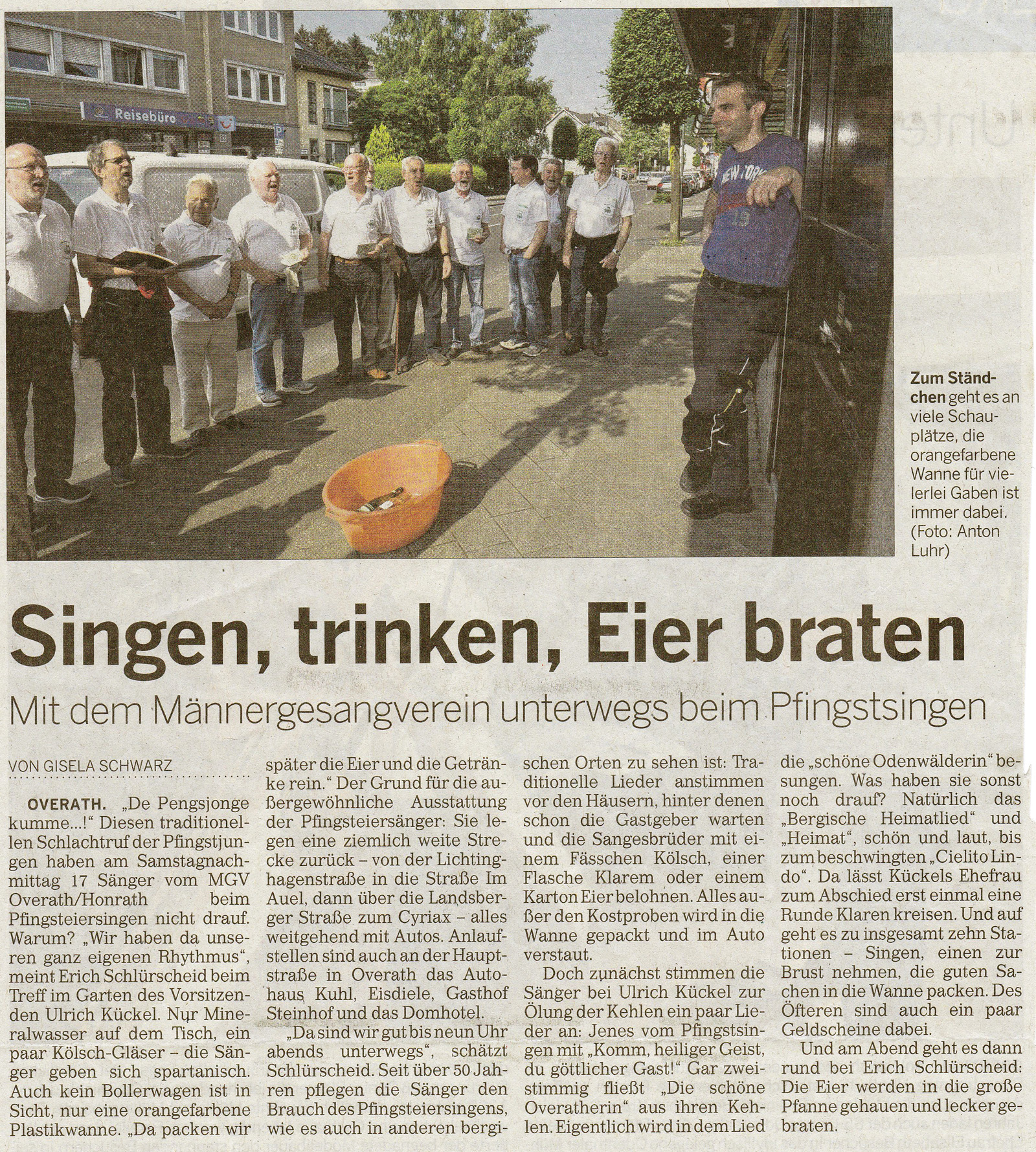 Tradition und Brauchtum zu pflegen gehört zum Repertoire des Männergesangvereins Honrath-Overath. 20 Sänger des MGV kennen die Stationen an denen ein Ständchen zum Pfingsteiersingen gesungen werden muss. Musik und Chorfreunde warten auf die Uhrzeit abgestimmt schon auf den Vortrag der Sänger. Es beginnt mit dem Eingangslied „Komm heiliger Geist du göttlicher Gast“ Eier, Wurst, Spirituosen und finanzielle Zuwendungen im Umschlag werden in den Korb gelegt und dabei gemütliche Gespräche mit den Zuhörern geführt. Es folgt ein Dankeslied "Schöner Grüner .." in dem auch auf den guten Zweck der Aktion verwiesen wird. Mit dem inzwischen schwer gewordenen Korb geht es zur Aufbereitung des Inhalts zur Familie Erich Schlürscheid in Overath. Die ganze Familie war auf den Beinen um das Eier-Wurstmenü möglichst schmackhaft mit Brot und Getränken für die Sänger zu präsentieren. Echt köstlich meinten die Sänger beim gemütlichen Beisammensein. Mit Musik und Gesangsvorträgen ging es beim ehemals reinen Junggesellenfest stimmungsvoll zu. Trinklieder, Bergisches Heimatlied, Schöne Overatherin, Cielito Lindo und Weinland gehörten unter anderem zu Vorträgen des Chores. Der Chor bedankt sich besonders bei Familie Schlürscheid für die schöne Ausrichtung des Abschlusses zum Pfingsteiersingen und allen Gönnern des Chores für die Unterstüzung zu den Chorveranstaltungen. Besonders haben uns auch die positive Bewertungen des Galakonzertes zum 100 Jährigen Chorjubiläum im Cyriax gefreut. Nochmal vielen Dank an alle Sponsoren und alle die zu diesem netten Nachmittag beigetragen haben. |
