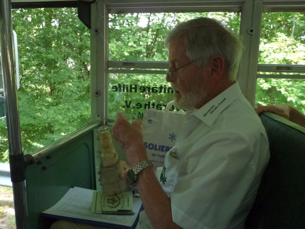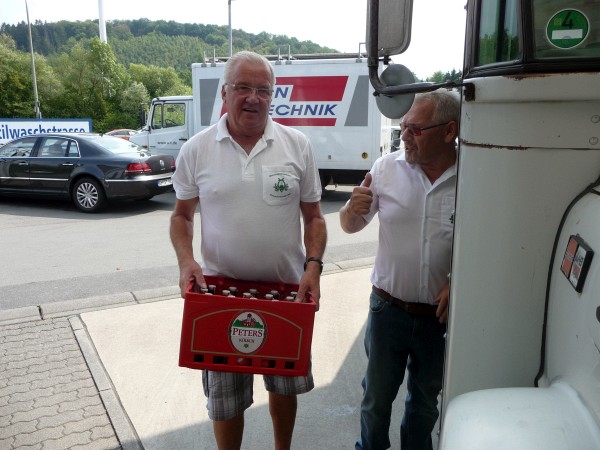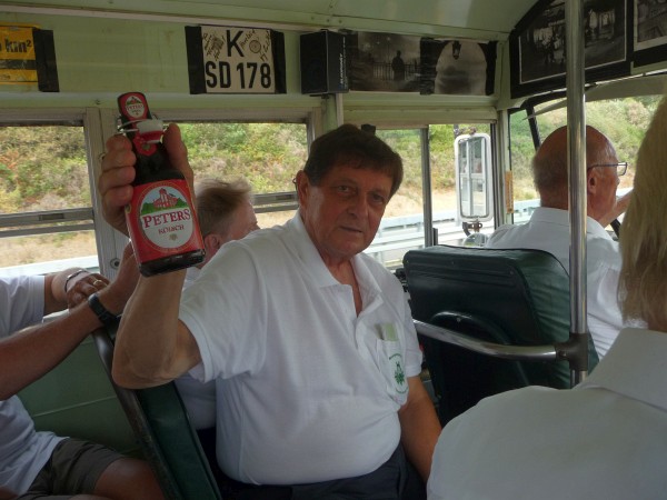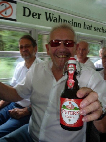 Das Klima im Buss wird durch das Seitenfenster geregelt. Mit geringer Geschwindigkeit gehts durchs Bergische Land. Die eingebaute Stereoanlage unterhält die Gäste mit stimmungsvollen rheinischen Schlagern während der Fahrt. Der Ablauf der Brauereikunst wurde von einer Führerin von der Ernte der Rohstoffe, Lagerung und Aufbereitung bis um Endprodukt umfangreich, auch für Laien nachvollziehbar, erklärt und mit einem schmackhaften Abschlussessen nach dem interessanten Rundgang belohnt. Gäste im Restaurant aus der Ukraine und andere Besucher waren begeistert von den Liedvorträgen des an diesem Tag von Wolfgang Reisert geleiteten Chores MGV Eintracht Honrath - MGV Overath. Wie gewohnt bei Ausflugfahrten ging die Fahrt nach Hause mit steigemdem Stimmungkarussel zurück nach Overath. Ein bleibendes Erlebnis des Männerchore und vielen Dank an Herr Kuhl und dem Festausschuß für die Organisation. Bilder von Fritz Groß |